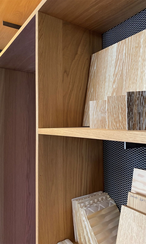Hos design- og byggevirksomheden Kompleet på Amager står der nu en smuk, omsluttende materialereol klar til at inspirere de kreative processer. Den imponerende reol er opført i Shinnoki fra Keflico – i farven Natural Oak, et klassisk og elegant valg, som vil bevare sit æstetiske udtryk i mange år frem.