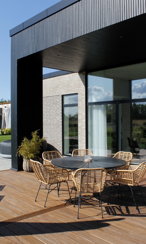 Ud fra terrassen er der direkte adgang til resten af haven og udsigt til uberørte, grønne områder. De store vinduespartier med skydedør får den 50 kvm. store terrasseområde til at fungere som en naturlig forlængelse af huset.
