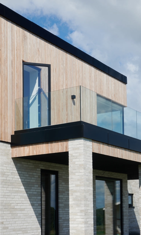 Thermo-D Fyr Premium trælister er blevet brugt som gennemgående materiale. Træet er blandt andet anvendt omkring vinduerne, på søjler, udhæng og ved terrassen.