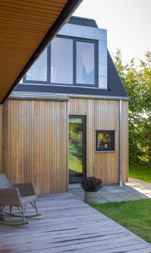 Sommerhuset er opført på det oprindelige fundament, hvor store vinduespartier åbner sig mod terrassen og det fantastiske kig over Limfjorden. For at bryde facadens linjer valgte arkitekten et felt med vandret monterede brædder, hvilket skaber et taktilt og levende udtryk. Valget af træ blev grundigt overvejet. Thermo Fyr var på tegnebrættet, men bygherre ønskede den klassiske, eksklusive Western Red Ceder. Det valg sætter sit tydelige præg på huset. Den varme tone og den naturlige patinering gør cedertræet til et materiale, der både matcher omgivelserne og understreger husets kvalitet.