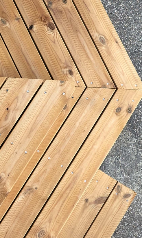 Terrassebrædderne har en rillet bagside, som er synlig og giver karakter til gelænderkonstruktionen, hvor bræddernes glatte overside ses på både trappen og terrassen.