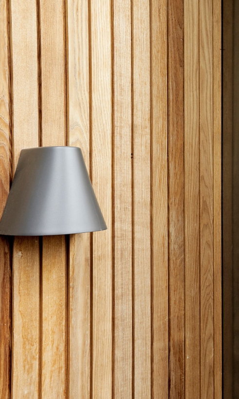 Hele facaden, på nær kælderetagen, er udsmykket med lameller, udført i det varmebehandlede Thermo-D Ask træ.