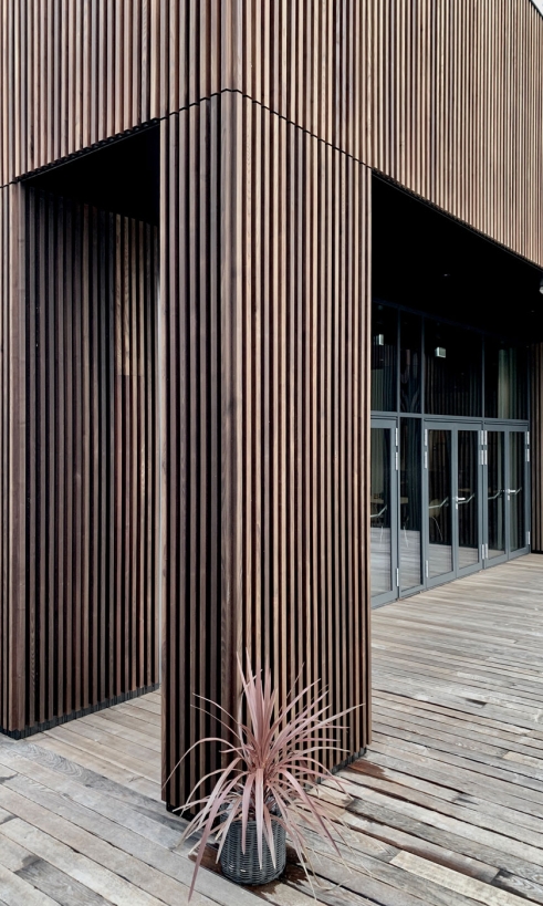 Woodfac er et komplet facadesystem bestående af bæredygtige og brandsikrede lameller i træ. I dette tilfælde er lamellerne lavet af Thermo-D Ask.