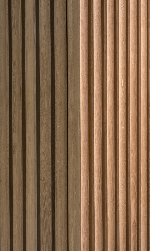 Materiale Thermo Fyr terrassebrædder og lameller, nanoperforerede plader med egefiner, egefineret MDF, massive egelister
