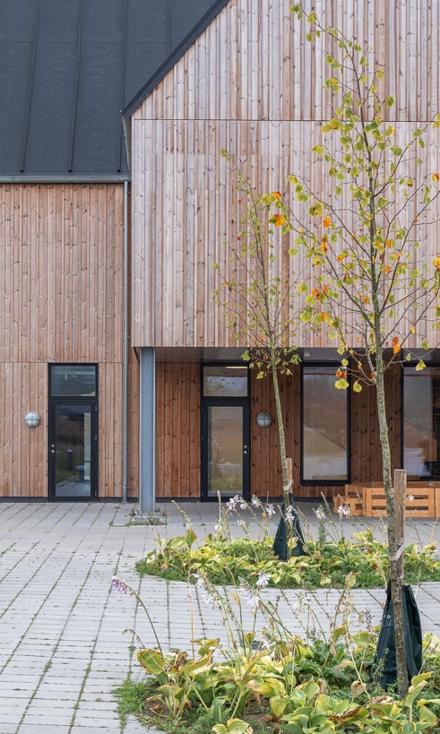 De karakteristiske gule murstensfacader er blevet udvidet med en tilbygning, hvor der er anvendt træbeklædning i Thermo fyr. Træet skaber en levende kontrast til murværket og giver skolens facade et nutidigt udtryk, der både er robust og imødekommende.