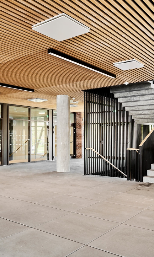 Til væg- og loftbeklædning på Skolen i Bymidten er valget faldet på brandimprægneret birkekrydsfinér, som er blevet skåret op til lameller og lakeret på den ene side. En lakering der giver træet et dybere udtryk, men samtidig gør det mere hårdført i et miljø, hvor dette er påkrævet.