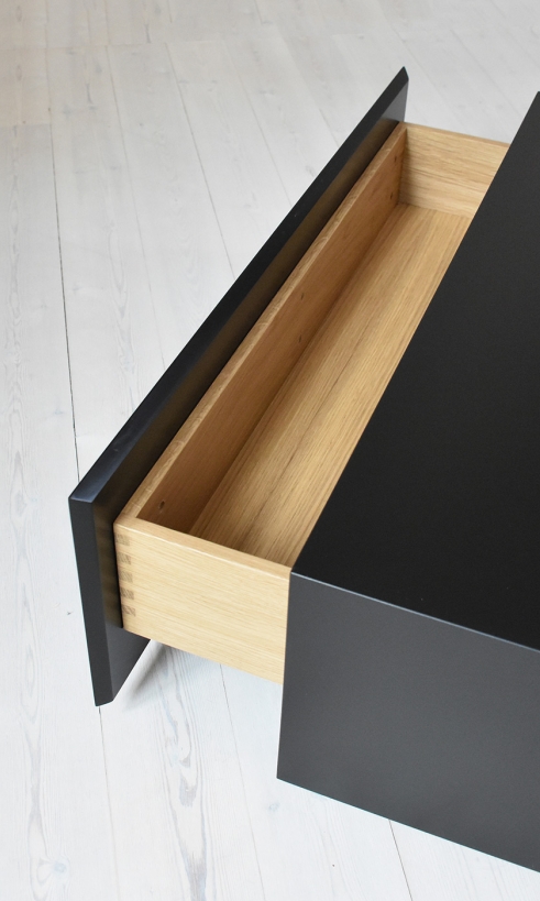 I designet af sofabordet har Anne brugt en klassiker indenfor træverdenen i form af vores smukke egetræ. Hun har forvandlet det til en bakke og en skuffe til det unikke sofabord.