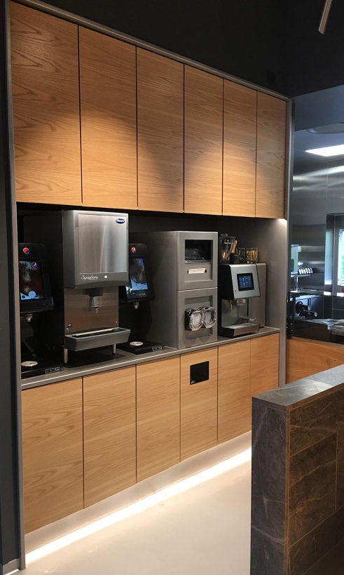 Fronterne og bordpladerne er lavet af massivt egetræ i møbelkvalitet. Bag sodavandsmaskinerne, finder man det slidstærke kompaktlaminat i sort.