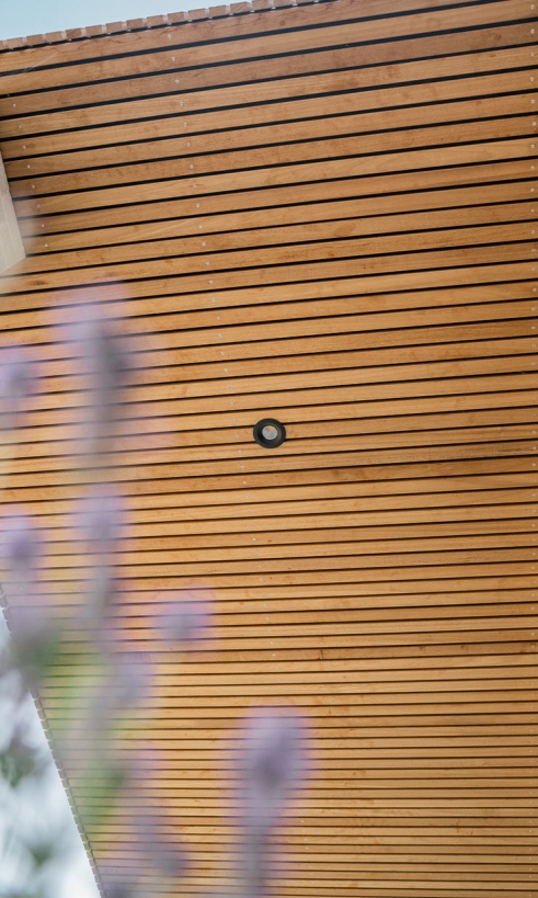 Facadelisterne i den varmemodificerede træsort Thermo-D Ayous er brugt på husets forskellige overflader. Blandt andet under udhæng, til den overdækkede terrasse samt imellem vinduerne. Det giver et smukt udtryk og får villaens ydre til at fremstå moderne, personlig og helt unik.