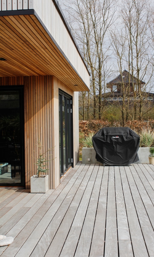 Til ombygningen af denne villa i Jylland faldt valget på den lette, bløde og samtidige sprøde ceder, som komplimenterer de lyse mursten på facaden. I kontrast til den lette træsort på facaden står den imponerende træterrasse i Ipé, en bomstærk træsort - træets svar på Rolls-Royce.